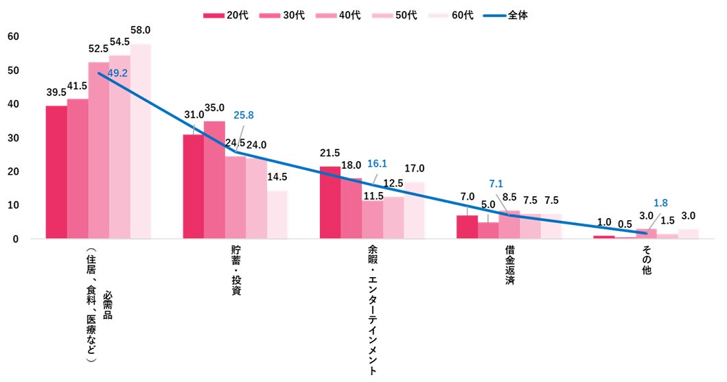 2024年の予算編成において、最も優先順位の高い支出は「必需品(住居、食料、医療など)」が全体の約半数を占め、年代が上がるほど高くなる傾向が見られた。