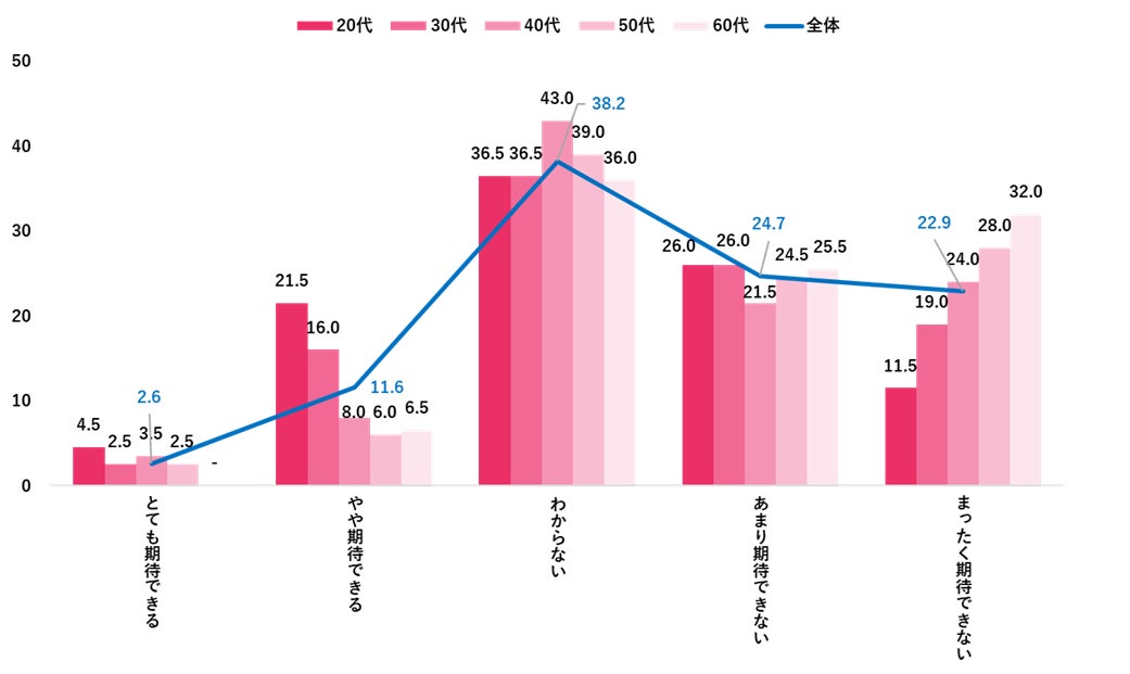 この春の賃上げについて、全体では「やや期待できる」(11.6%)、「とても期待できる」(2.6%)を合わせて14.2%と期待度は低い。20代では「やや期待できる」(21.5%)、「とても期待できる」(4.5%)を合わせて26.0%が期待感を抱いており、他の年代よりも期待度が高かった。