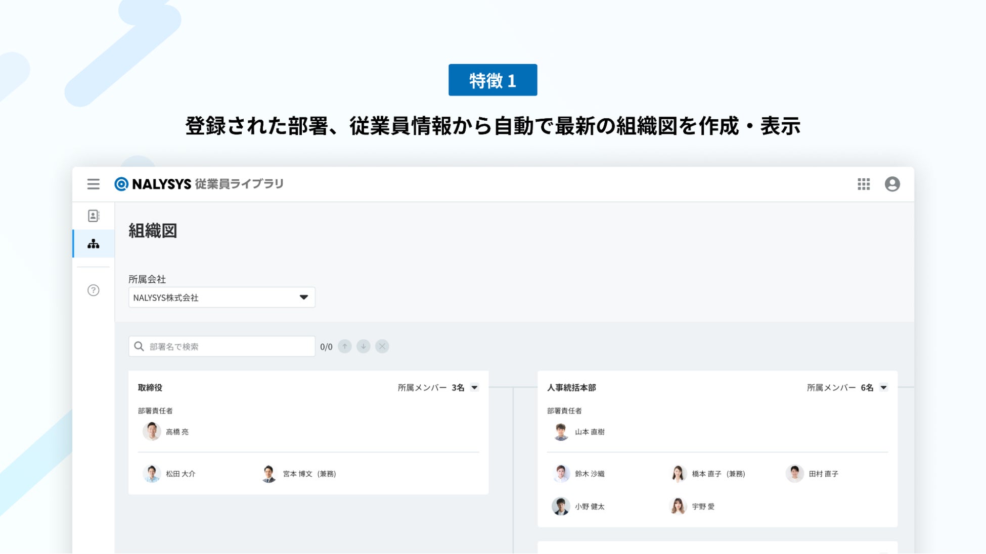 特徴1:登録された部署、従業員情報から自動で最新の組織図を作成・表示