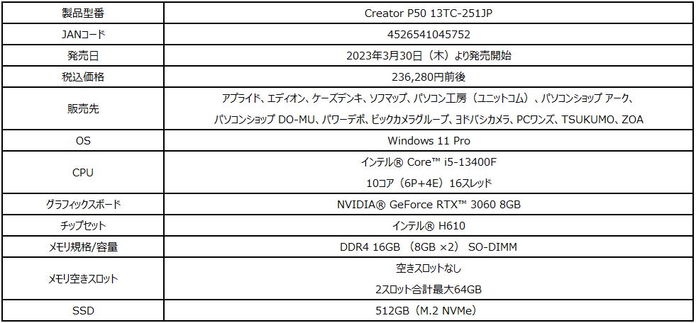 フルHDコンテンツ制作に特化したコンパクトなクリエイターデスクトップPC 第13世代インテル® Core™ i5搭載 「Creator P50 13TC-251JP」発売