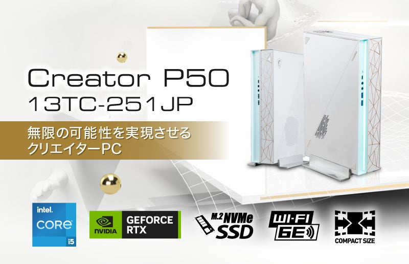 この度、エムエスアイコンピュータージャパン株式会社は2023年3月30日(木)よりデザイン性に優れ置き場所に困らないコンパクト筐体を採用した高性能クリエイター向けデスクトップPCブランド「Content Creation」の新モデル「Creator P50 13TC-251JP」を発売いたします。第13世代インテル® Core™ i5-13400F、NVIDIA® GeForce RTX™ 3060 8GBを採用し、白を基調とした清潔感あるデザインを採用したクリエイター向けデスクトップPCが新たにラインナップに加わります。