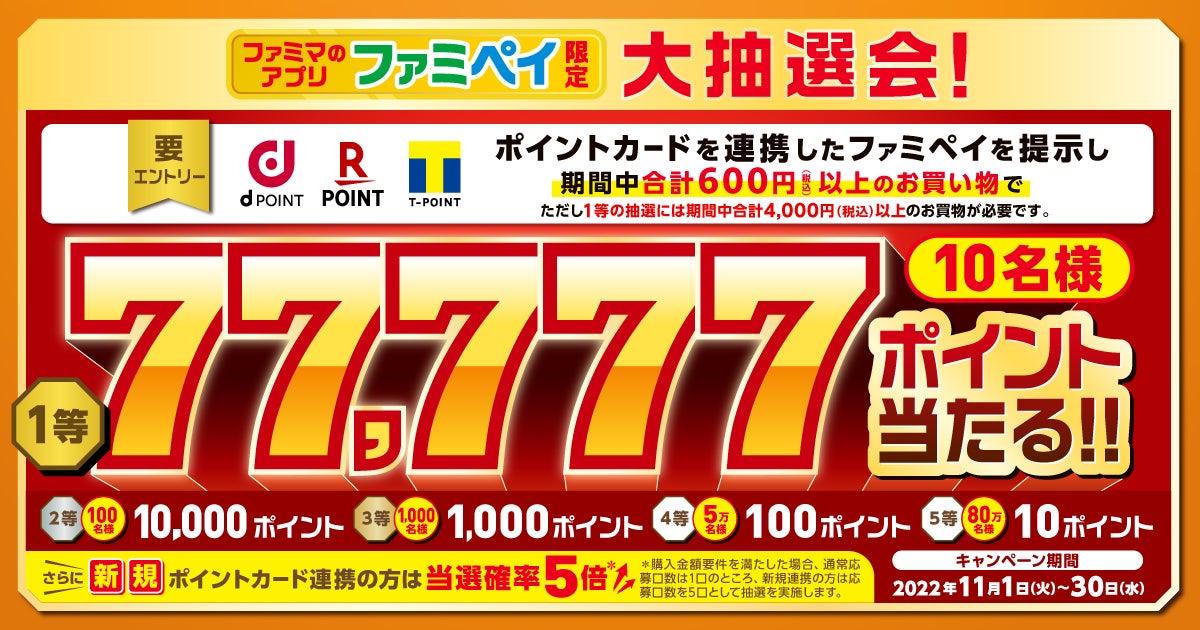 株式会社ファミリーマート(本社:東京都港区、代表取締役社長:細見研介)は、昨年から取り組んでいる5つのキーワードの1つである「たのしいおトク」の一環として、2022年11月1日(火)よりファミマのアプリ「ファミペイ」(以下:「ファミペイ」)限定でdポイント・楽天ポイント・Tポイントのいずれかのポイントが抽選で最大77,777ポイントあたる「ファミマのアプリ大抽選会」を開催いたします。