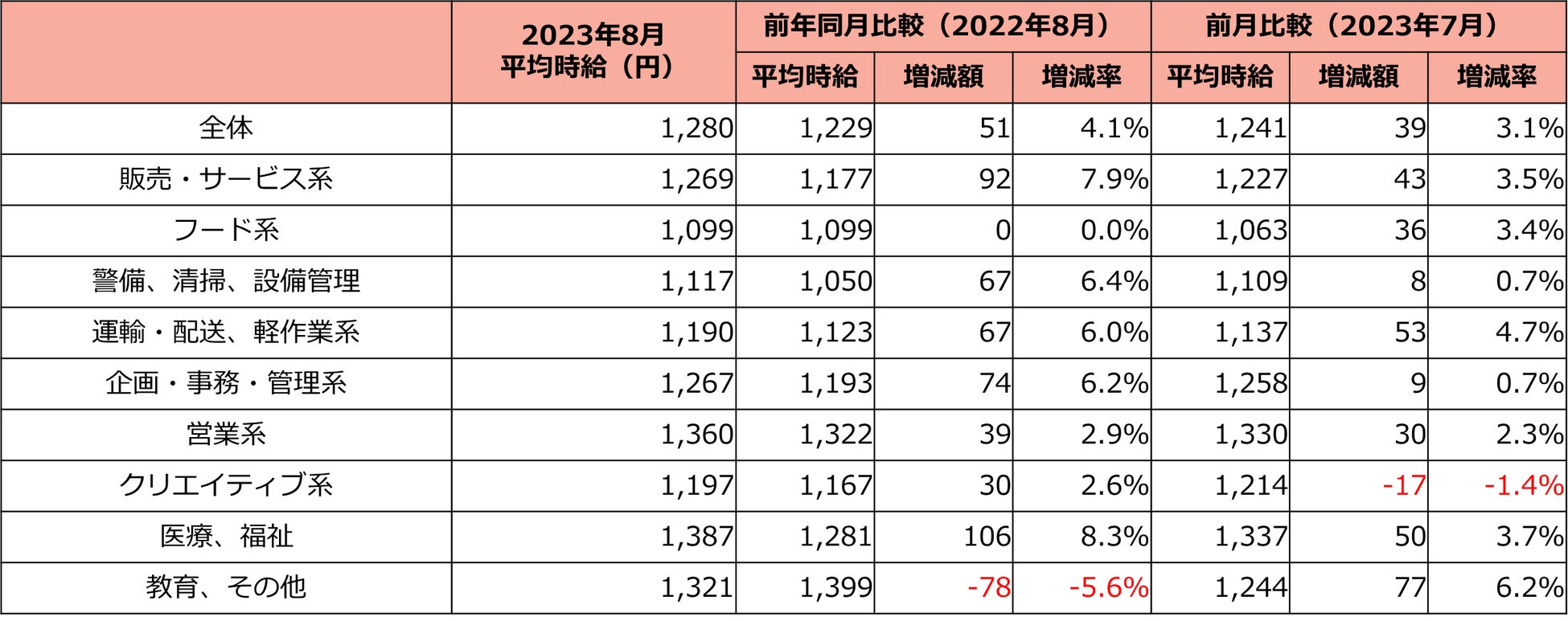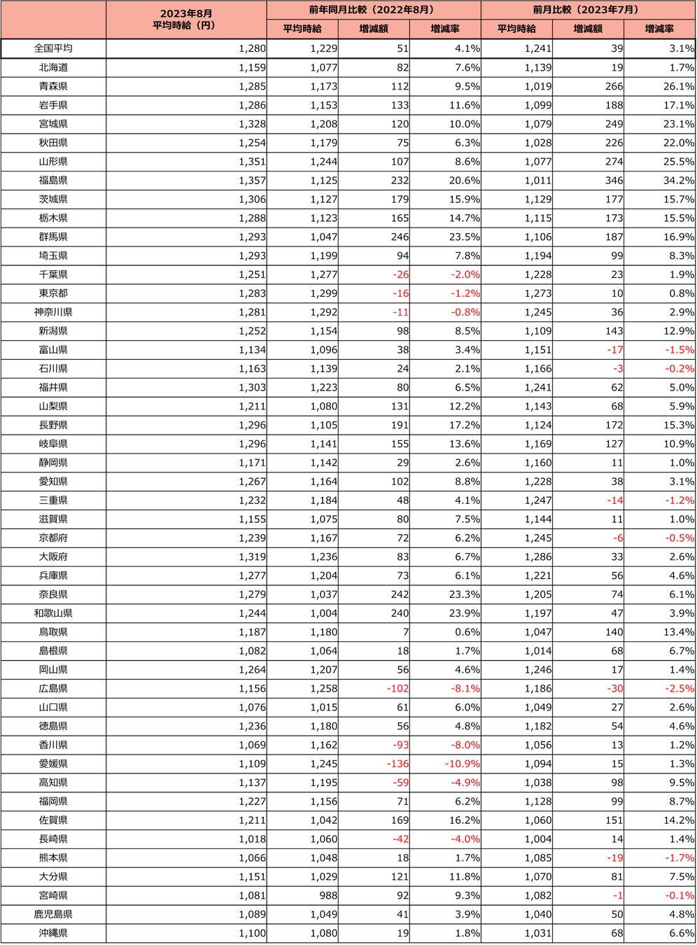 全国の8月度平均時給は1,280円で、2023年の最高額を記録。 東海・関西では、平均時給・前年比上昇額ともに今年の最高額に。