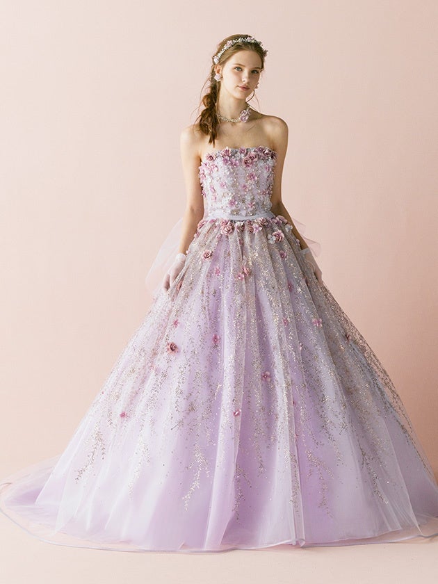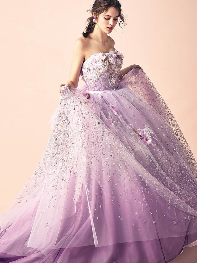 ラグジュアリー&フェミニンをコンセプトに、細部までこだわったクチュール感あふれる一着。ベースのグラデーションチュールには、人気の2色グリッターを重ね、華やかなインパクトをプラスしました。
