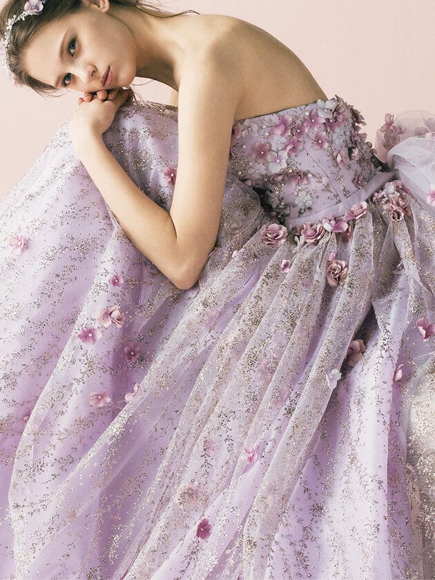 甘すぎないラベンダーカラーや落ち着いたアンティークカラーのフラワーなど、甘辛バランスが絶妙なロマンティックドレス。ゴージャスでいてフェミニンな、ANTEPRIMAらしいフラワードレスです。