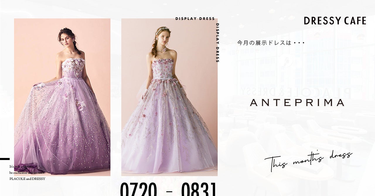 ウェディングのテーマパークカフェ“DRESSY CAFE” 7.8月の展示ドレス