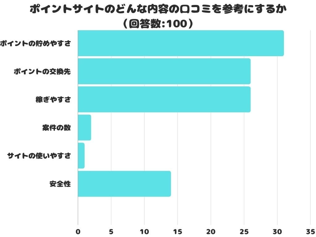 ポイントサイトのどんな内容の口コミを参考にするかをアンケートにて調査したところ、1位は「ポイントの貯めやすさ」でした。