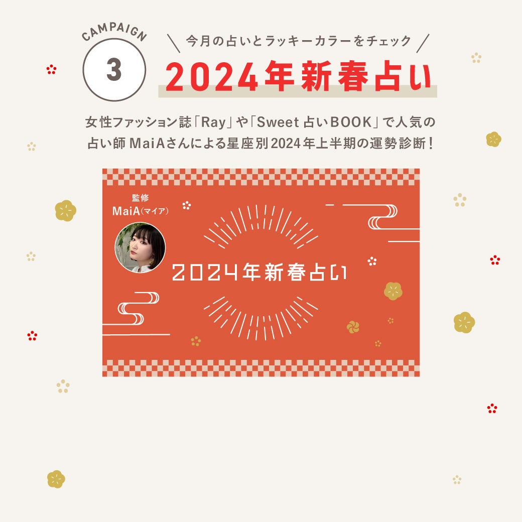 女性ファッション誌「Ray」や「Sweet占いBOOK」で活躍する人気占い師MaiAさんによる星座別2024年1月の運勢とラッキーカラーを12星座別でご紹介いたします。