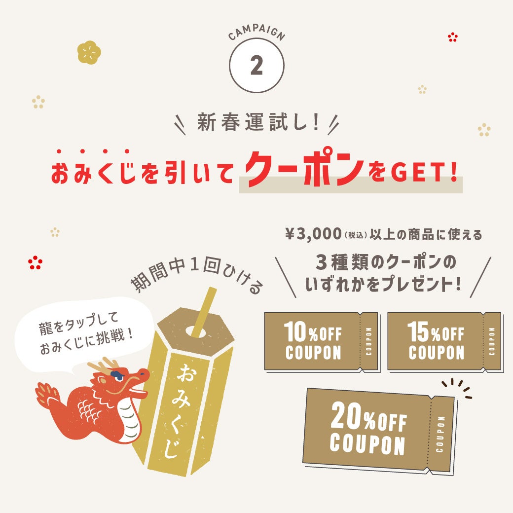 期間中に「STRIPE CLUB」にログインまたは新規会員登録で1回ひける「おみくじ」を実施。税込み¥3,000以上の商品に使える3種類のクーポンのいずれかをプレゼントいたします。