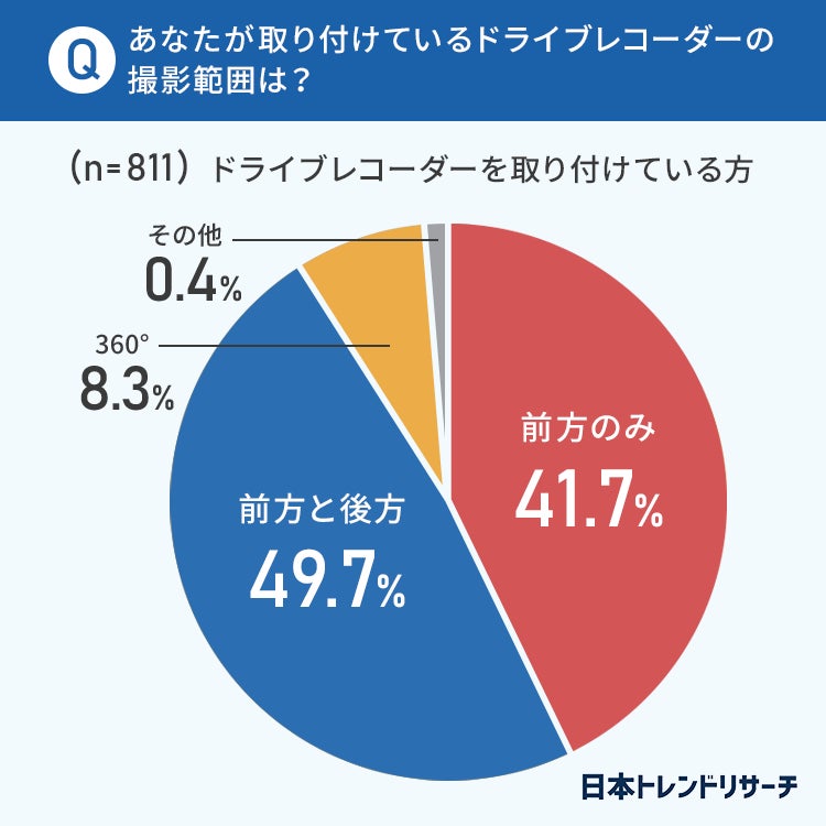 58.2%の方が、ドライブレコーダーを取り付けており、撮影範囲は「前方と後方」タイプの方がもっとも多いようです。