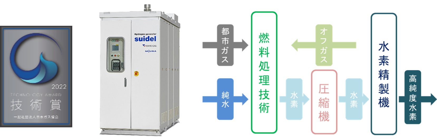 東京ガス株式会社、三浦工業株式会社、東京ガスケミカル株式会社の3社で共同開発した小流量タイプ水素発生装置「suidel(スイデル)」が、このたび、ガス事業およびガス事業者の健全な発展と都市ガスの普及に貢献する技術として、一般社団法人日本ガス協会主催「2022年度日本ガス協会技術賞」*1を受賞しました。