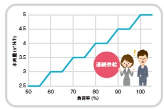 お客さまの水素使用量に応じ、50~100%の範囲で自動制御。発停を抑え、水素を連続的に供給します。