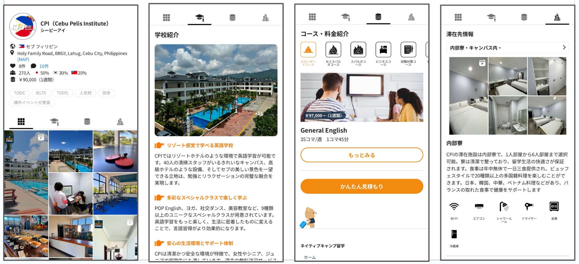 ネイティブキャンプ留学では、ユーザーが必要な情報を分かりやすく把握できるよう、常に丁寧で明確な情報提供を心がけています。CPIの詳細情報は、以下の4つのカテゴリーに分けて掲載しており、知りたい情報を的確にお届けします。