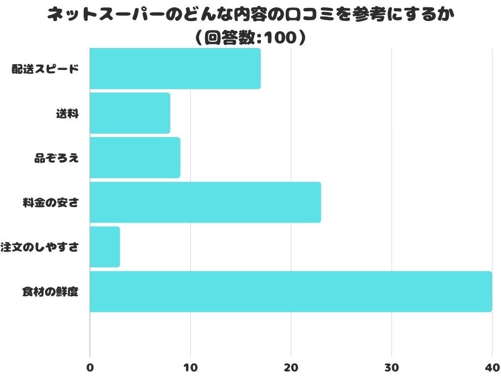 ネットスーパーのどんな内容の口コミを参考にするかをアンケートにて調査したところ、1位は「食材の鮮度」でした。