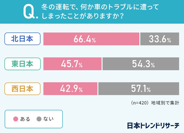 やはり「北日本」の方が66.4%ともっとも多い結果になりましたが、「東日本」「西日本」の方も4割以上が冬の運転でトラブルに遭ってしまったことがあるようです。