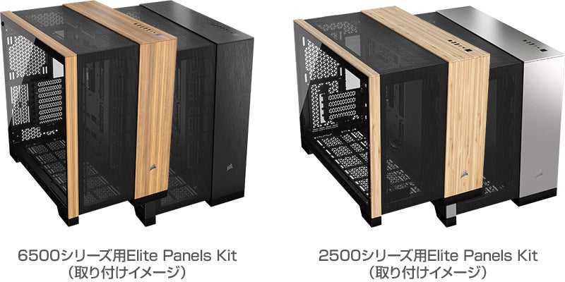 「6500/2500シリーズ用Elite Panels Kit」は、同社製ミドルタワー型PCケース6500シリーズとミニタワー型PCケース2500シリーズに対応する、フロントパネルとトップパネルのセットです。それぞれTeak、Bambooの2種類の木材パネルと、Obsidian、Satin Grayの2種類のアルミニウムパネルをラインナップしており、お好みに合わせてカスタマイズを楽しめます。