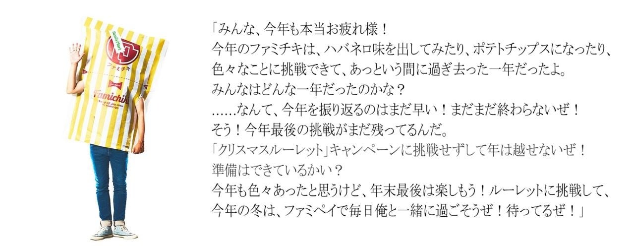 株式会社ファミリーマート(本社:東京都港区、代表取締役社長:細見研介)は、昨年から取り組んでいる5つのキーワードの1つである「たのしいおトク」の一環として、2022年12月1日(木)から12月25日(日)まで、ファミマのアプリ「ファミペイ」(以下:「ファミペイ」)限定で、1日1回、毎日挑戦でき、当選すると総勢1,000万名さまに、最大で“ファミチキ1年分”相当のファミペイボーナスがもらえる「クリスマスルーレット」を開催いたします。