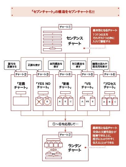 「セブンチャート」とは、文章を分解してはめ込んでいくだけで、誰でも簡単に「論理の構造」を可視化できる、7種類のシンプルなフレームワークです。