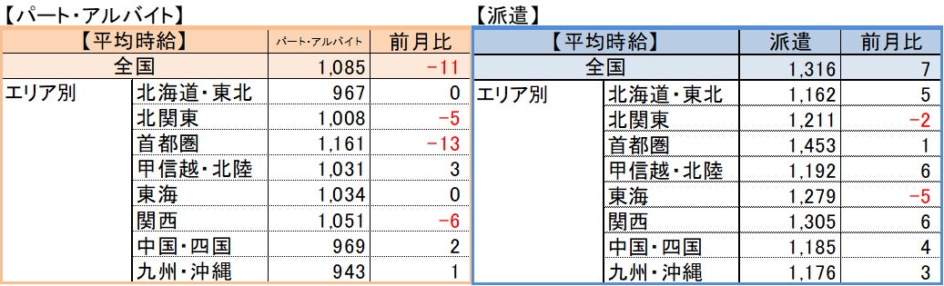 | 【パート・アルバイト】全国・全職種平均時給は1,085円。前月比-11円。前年同月比+34円。 【派遣】全国・全職種平均時給は1,316円。前月比+7円。前年同月比+22円。 【傾向】パート・アルバイトの平均時給は、全国・全職種平均よりも時給相場が低い「軽作業・物流・製造」カテゴリの求人が前月比138%となった影響を受け、やや下降した。しかし、 前年同月比は7ヶ月連続の上昇となり、 全体としては上昇傾向と言える。派遣の平均時給は、2021年6月以降、横ばいの傾向が続いている。 |