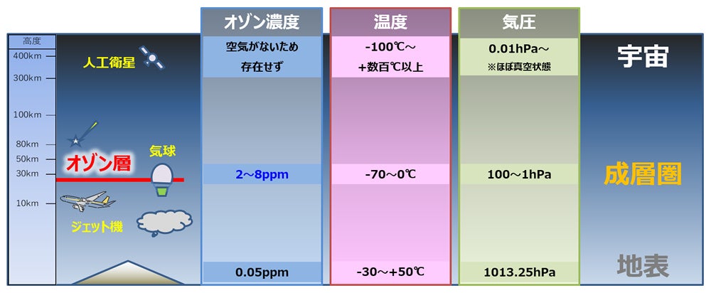 一方、成層圏には、地表の100倍にあたる濃度(2~8ppm)のオゾン層が存在します。このオゾン層は宇宙空間には存在しません。オゾンは無色の気体で、強力な酸化作用を持つため、屋外で使用されるゴム、プラスチック、塗料、繊維などに亀裂やひび割れを発生させる要因の一つとされています。そのため、成層圏で稼働する機器は、宇宙や地上とは異なる高濃度オゾン環境下での耐性評価や解析を通じた信頼性確保が重要となります。