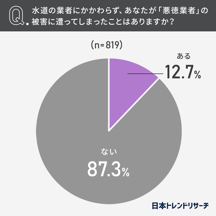 今回は、みんなの町の水道職人と共同で、事前調査で「水まわりのトラブルに遭ったことがある」と回答した全国の男女819名を対象に、「悪徳業者からの被害」についてアンケートを実施しました。