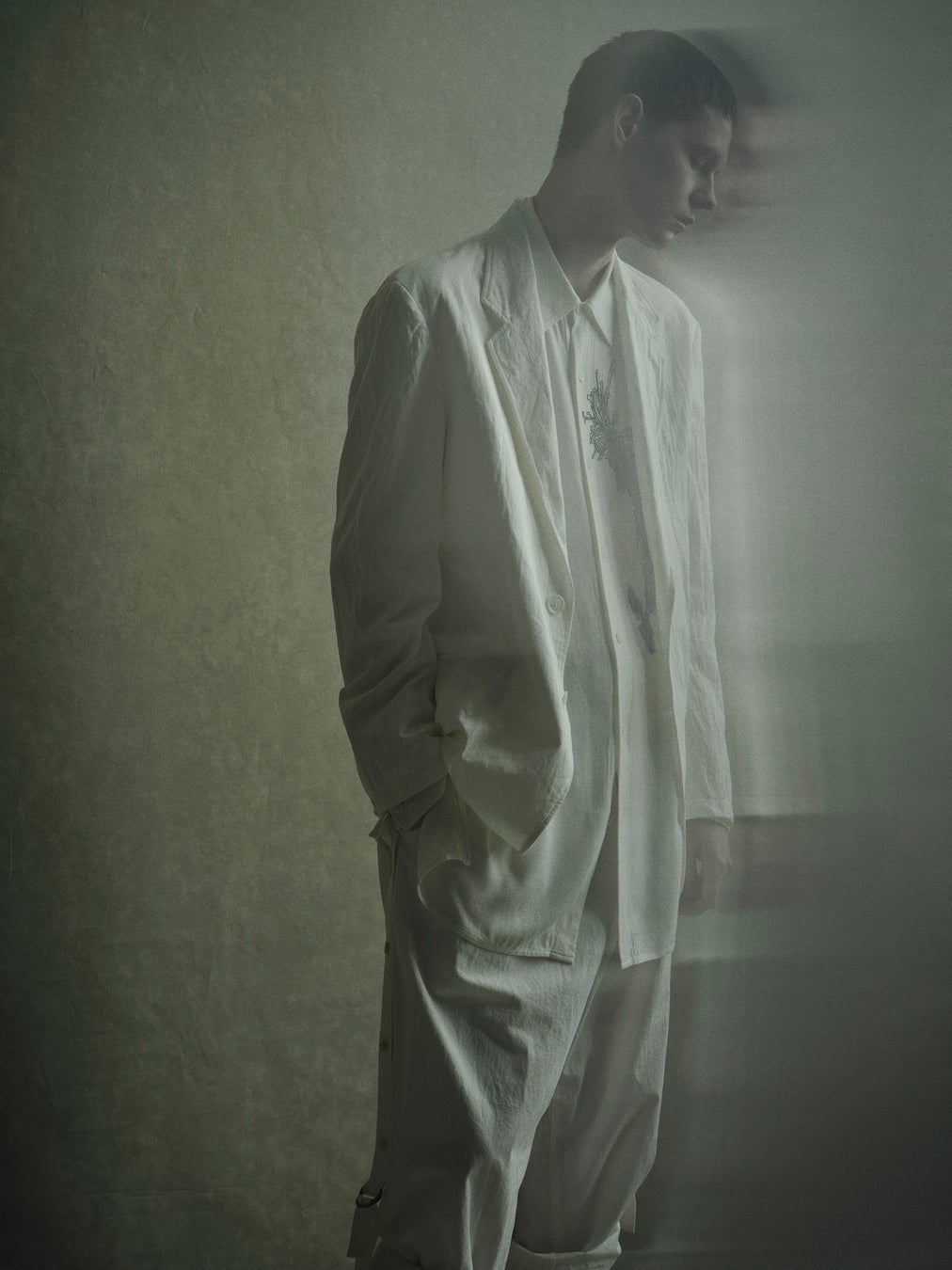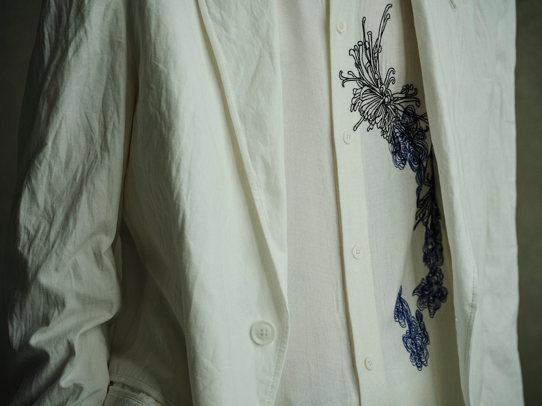 ナチュラルなムラ感を表現したタンガリー素材の2ツ釦テーラードジャケットとパンツ。パンツはベルトループを兼ねた側章が付いており、釦で留め外し可能なデザインです。オーバーサイズの台襟付きシャツは、インド織機の独特な風合いと菊と靄(もや)のモチーフを掛け合わせた刺繍で大きく「y」を表現しました。
