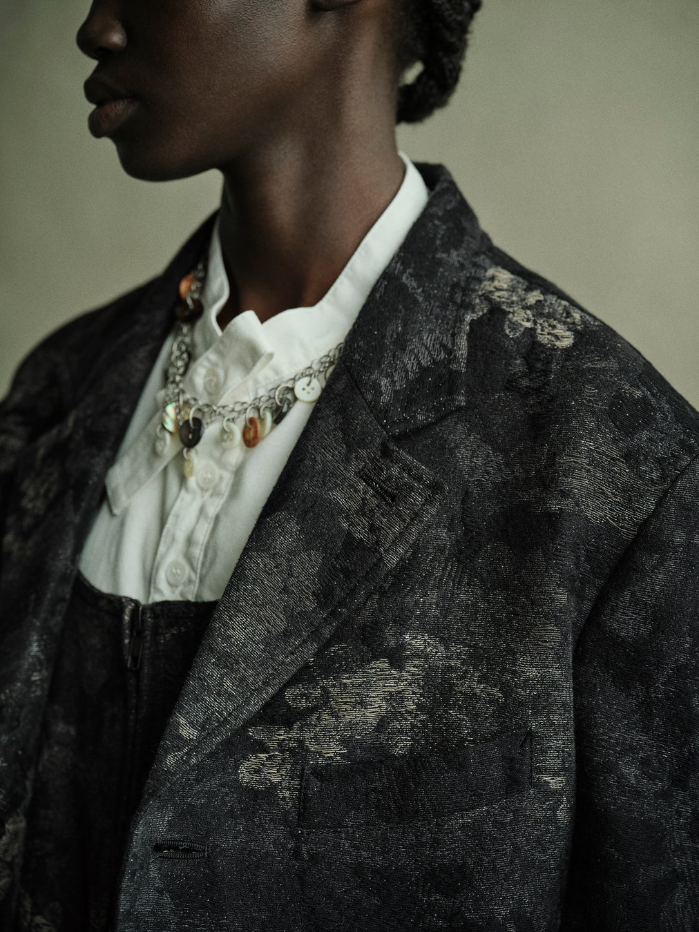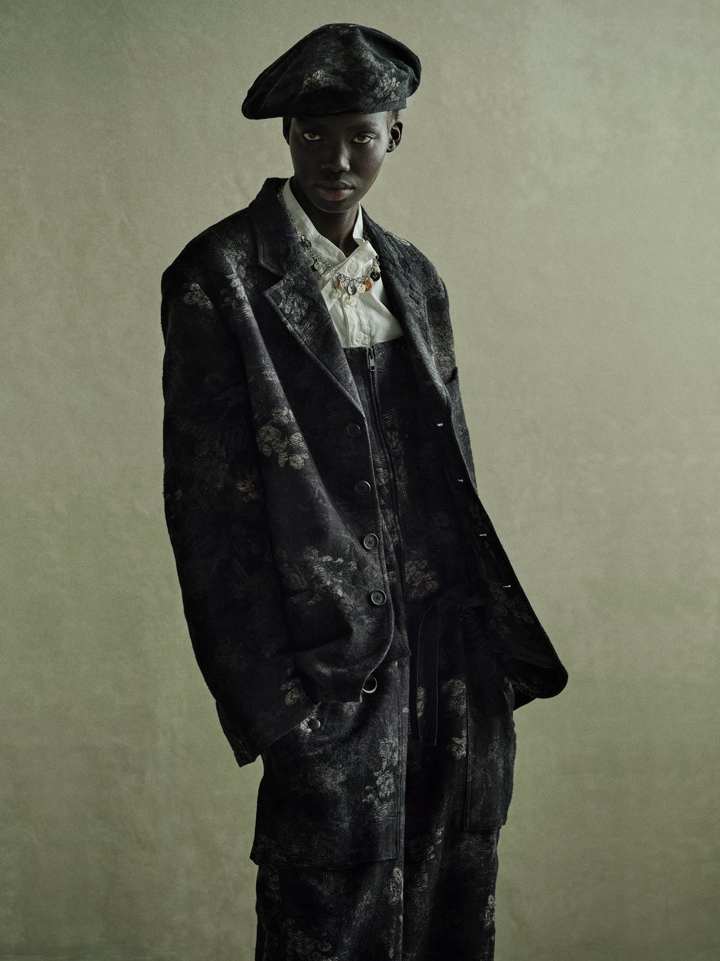 かすれ花柄を表現した4ツ釦のセミピークドラペルジャケットと7ポケットのオーバーオールのルック。細かい糸毛を使用したジャカード織を取り入れました。