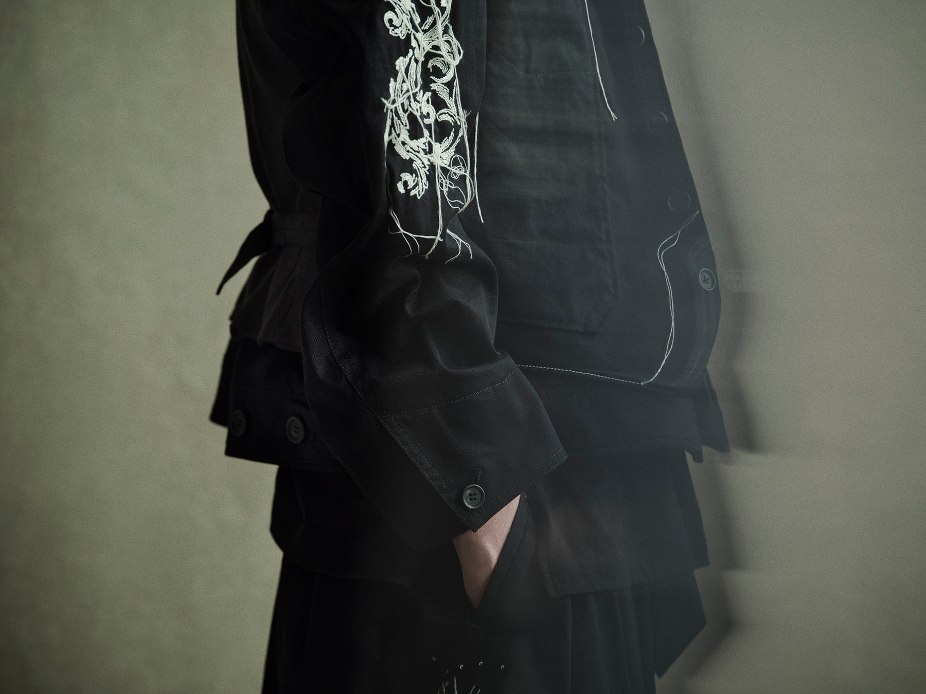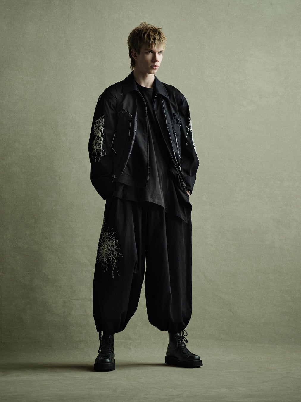 オーバーサイズのブルゾンに両袖と背中にバロック柄の刺繍を入れ、やや肉厚なカツラギの定番バルーンパンツの右前見頃には打ちあがった花火をイメージしたモチーフ刺繍で表現したルックです。
