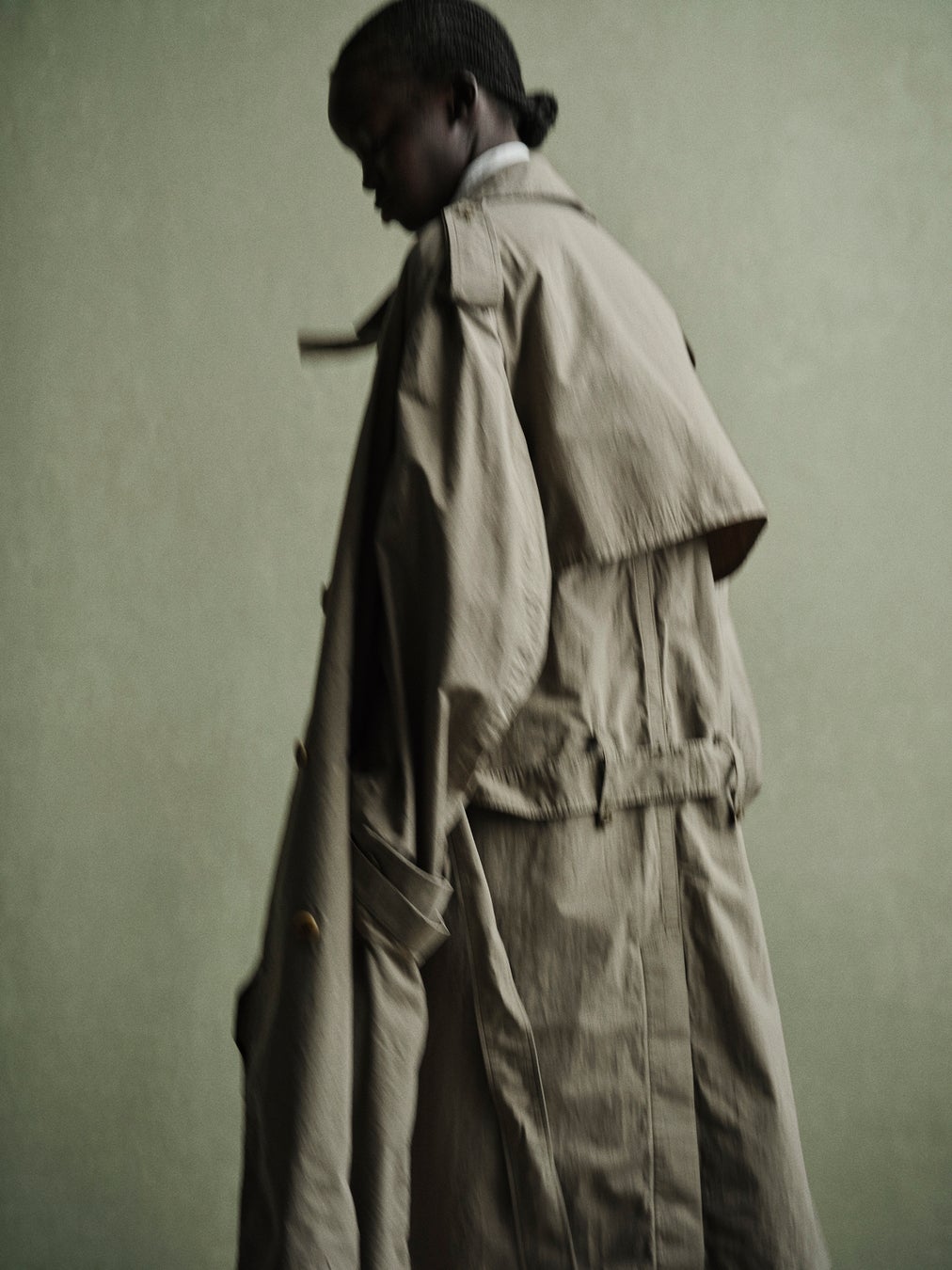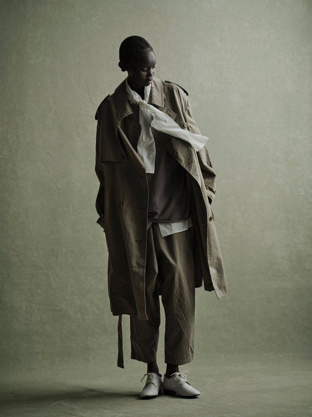 クラシックなデザインに、起毛のワッシャー加工を施すことでヴィンテージな雰囲気と柔らかい風合いを調和させたトレンチコートに、襟ぐりからたっぷりとしたストールが伸びるコットンシルクの半袖シャツをコーディネートした春夏らしく軽い素材を活かしたルックです。
