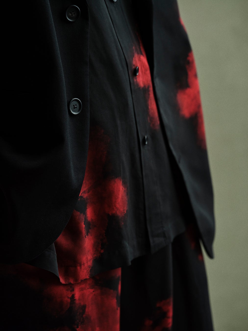 前身頃が左右段違いとなっているジャケット、軽やかなドレープのシャツとパンツには燃え上がる火をイメージしたモチーフをインクジェット捺染で全面にプリントした総柄のルックです。