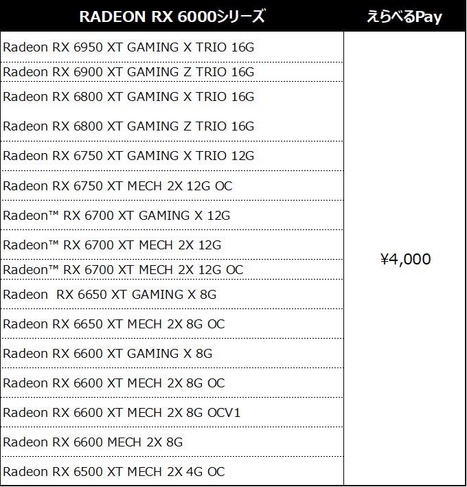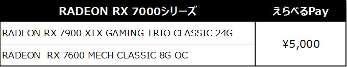 対象のRADEON RX 7000シリーズまたはRADEON RX 6000シリーズと、対象のX670/B650マザーボードセットで購入いただいた方に、最大11,000円分のえらべるPayをプレゼントいたします。