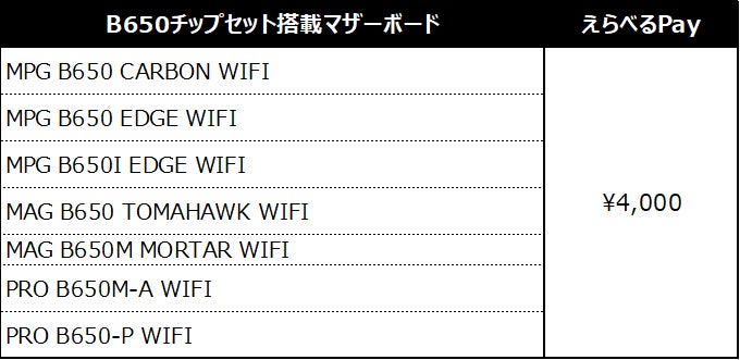 ⇒マザーボードで5,000円、グラフィックスカードで5,000円、ボーナス1,000円の計11,000円分のえらべるPayをプレゼント