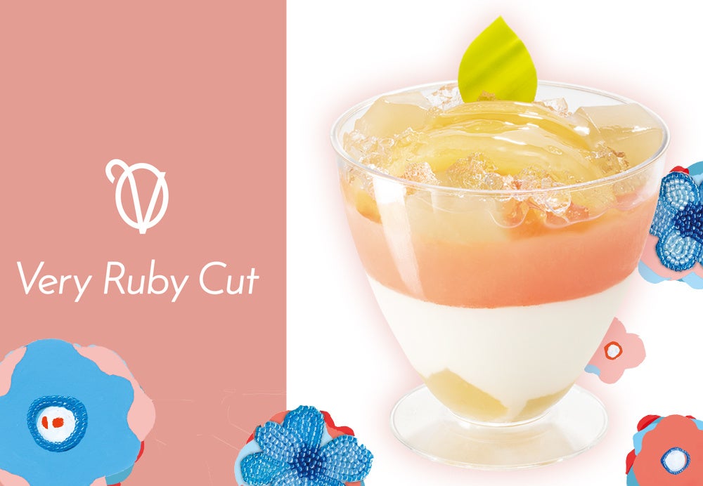 「Very Ruby Cut(ベリールビーカット)」がお菓子にこめたメッセージは 「Stay “Ruby Color” Show your True Color いつだってあなたらしく ルビーみたいに輝きつづけて!」。果実や木の実のおいしさをとじこめたルビー色の宝石スイーツ達の世界を、たっぷり楽しんでいただきます。