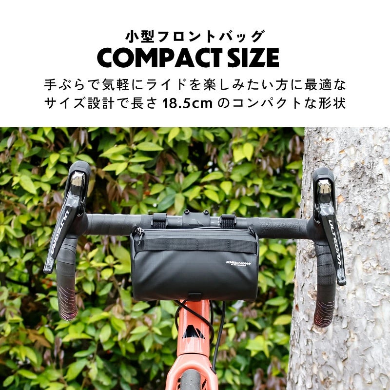 ゴリックスの小型フロントバッグは、手ぶらで気軽にライドを楽しみたい方に最適なサイズ設計で、