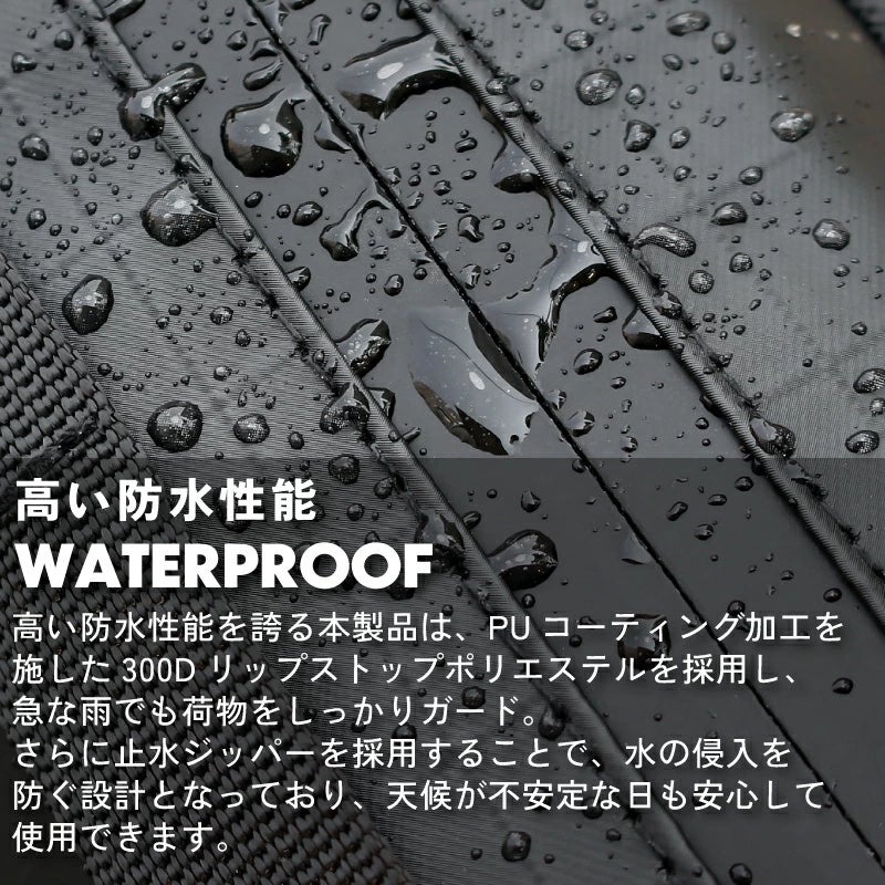 300D リップストップポリエステル(PUコーティング)耐久性が高く、軽量で引き裂きに強い素材を使用/止水ジッパー仕様 |