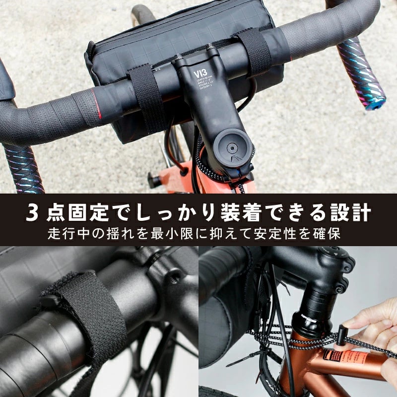 3点固定でしっかり装着できる設計で、ハンドル2点+調整可能なゴムストラップで
