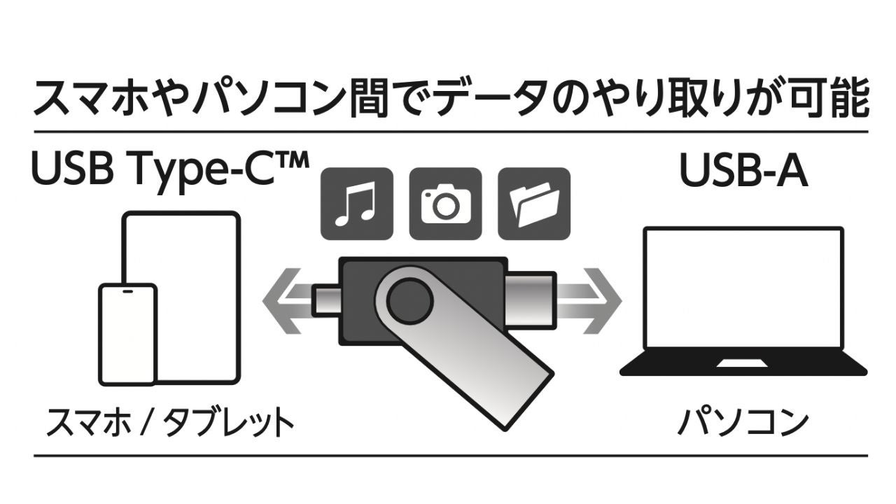■パソコン・スマートフォン・タブレットなど異なるデバイス間のデータ移動もこれ1台でカンタンにできる、USB Type-C(USB-C)/USB-A両方のコネクターを搭載したUSBメモリーです。