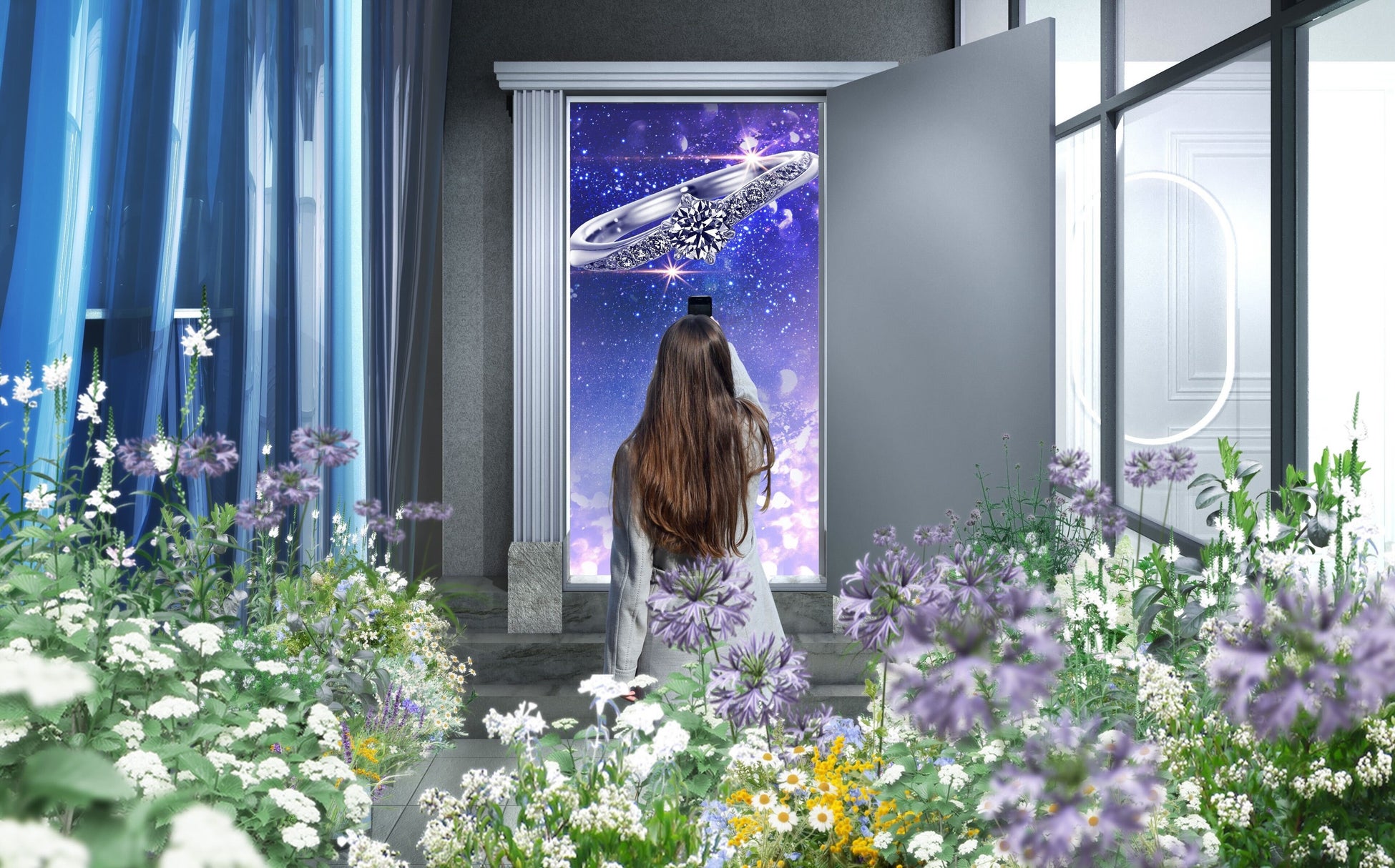 地球の奥底で数億年を経て誕生する、自然の奇跡によって作られるダイヤモンドと、婚約・結婚される「ふたり」に寄り添うという銀座ダイヤモンドシライシのブランドメッセージが、『NAKED FLOWERS FOR YOU』のコンセプトと重なることから、今回のコラボレーションが実現しました。本作品では、「自分の未来へ出会う旅」とし、パーソナライズ診断のQRコードをリーダーにかざして質問に答えていくと、自分にあう指輪のデザインと演出が浮かび上がります。没入感のある空間で、“あなたのために”生まれる指輪の物語を体験してみてください。