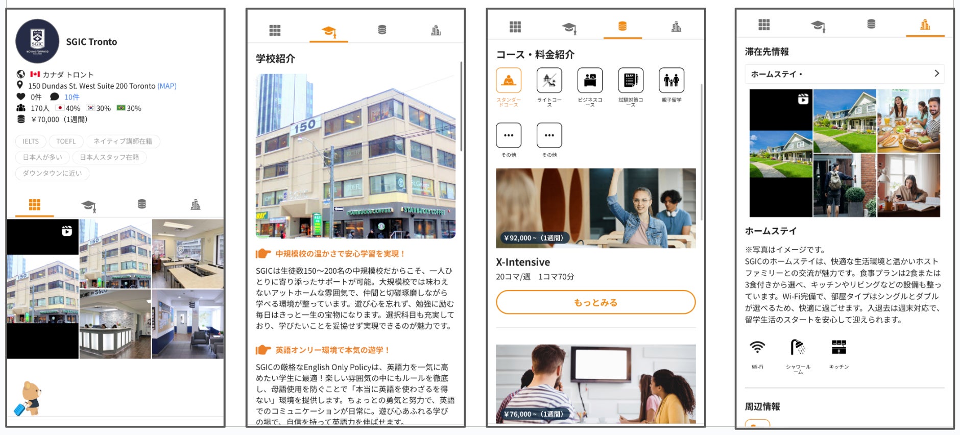ネイティブキャンプ留学では、ユーザーが必要な情報を分かりやすく把握できるよう、常に丁寧で明確な情報提供を心がけています。SGICの詳細情報は、以下の4つのカテゴリーに分けて掲載しており、知りたい情報を的確にお届けします。