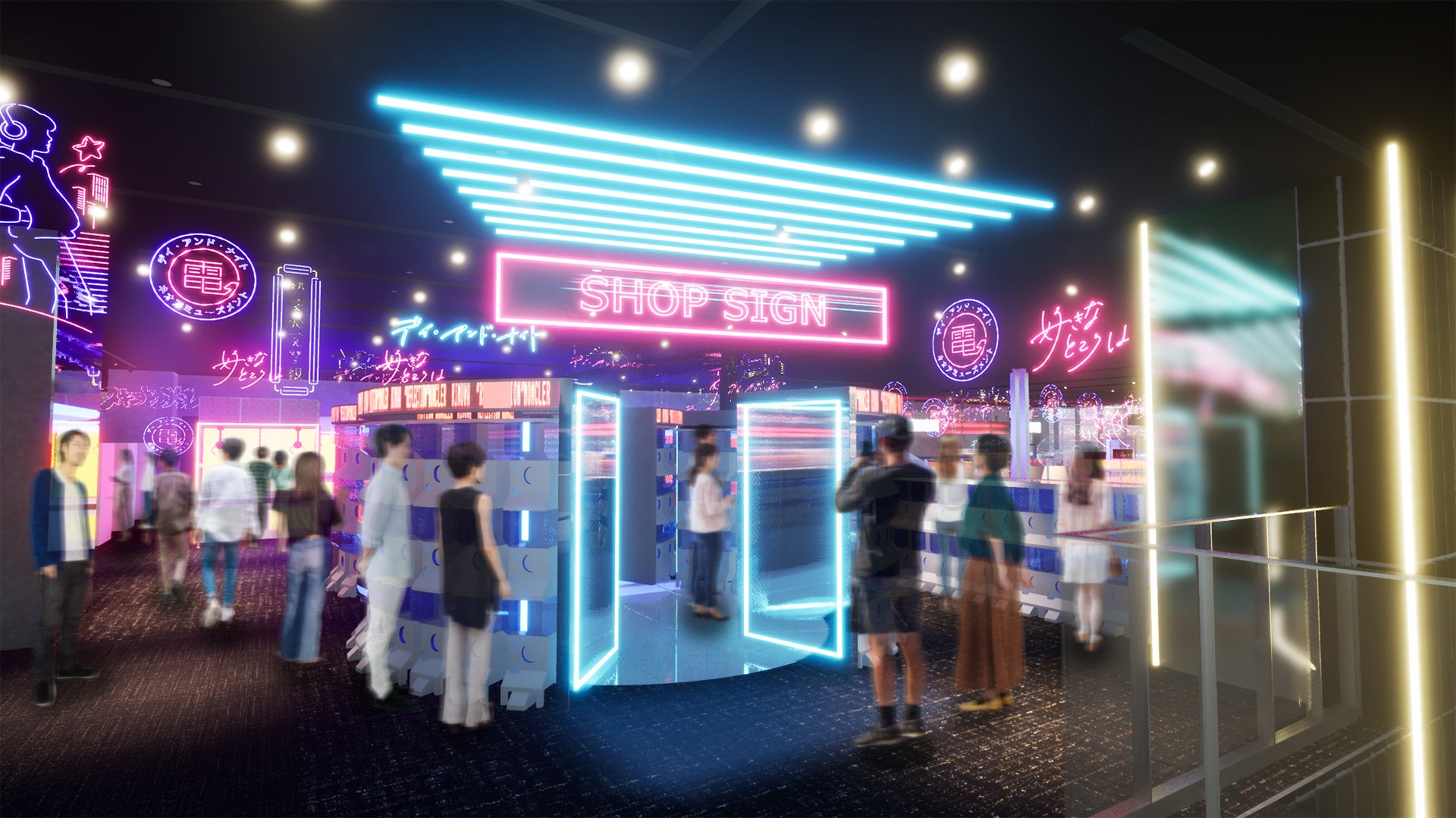 POPなネオンに囲まれた空間でバンダイナムコグループが取り扱うIPコンテンツをさまざまな角度から体験することで、訪れた方が好きなコンテンツに出会い、楽しみ尽くすことができる場を提供します。