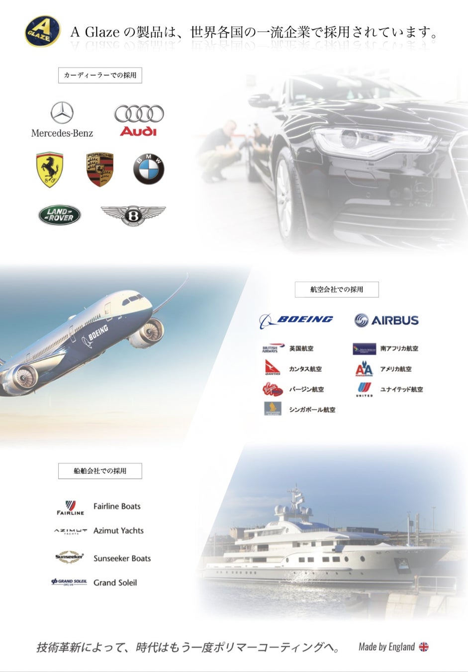 スーパーカーから、世界の大手航空会社や高級ヨットメーカーまで、世界が認めたAグレーズの「次世代ポリマー」は、下地処理からコーティングまで、簡単な手順でプロも納得のパーフェクトな仕上がりを提供します。