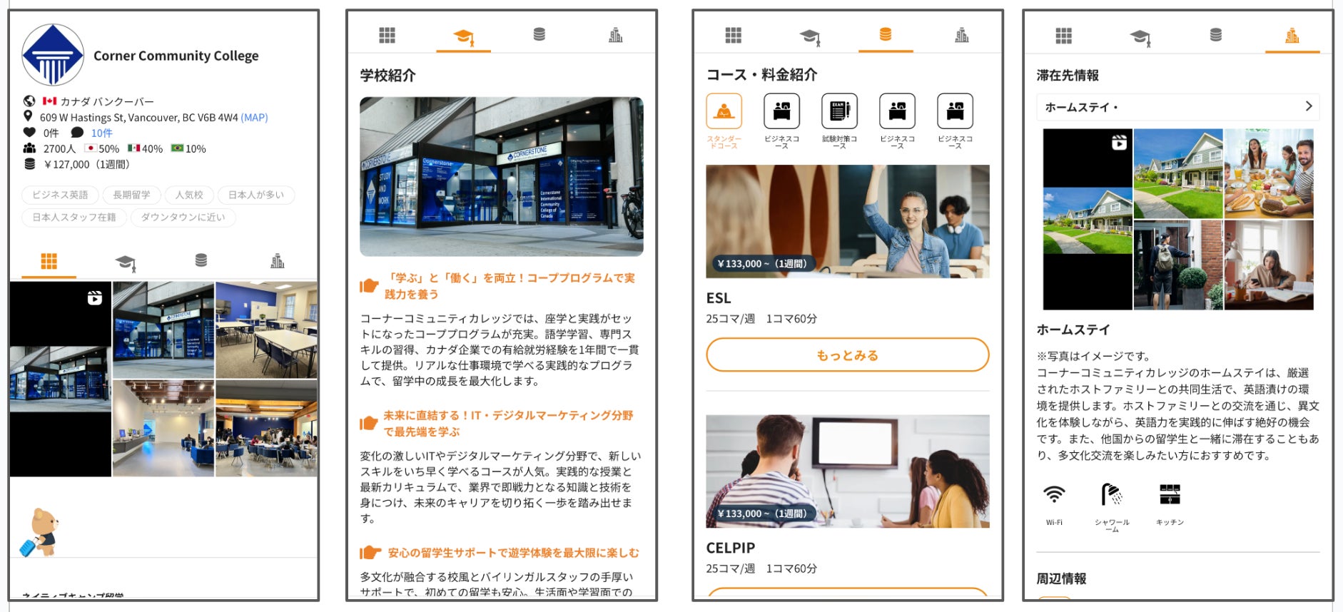 ネイティブキャンプ留学では、ユーザーが必要な情報を分かりやすく把握できるよう、常に丁寧で明確な情報提供を心がけています。Corner Community Collegeの詳細情報は、以下の4つのカテゴリーに分けて掲載しており、知りたい情報を的確にお届けします。