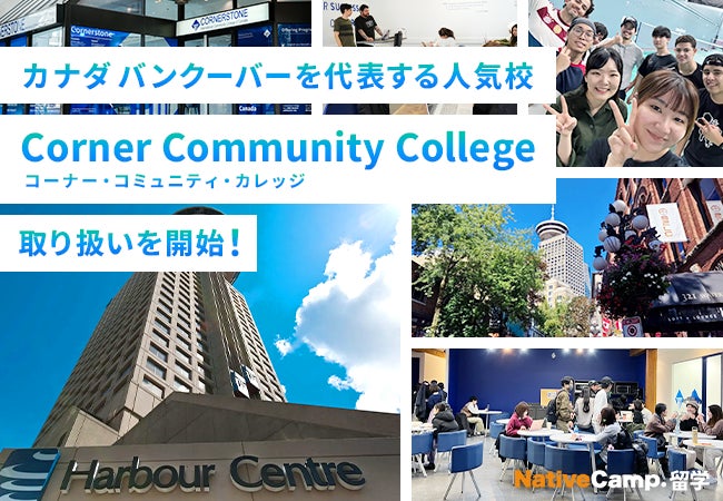 ネイティブスピーカーと回数無制限のオンライン英会話サービス「ネイティブキャンプ英会話」を展開する株式会社ネイティブキャンプ(東京都渋谷区 代表取締役: 谷川国洋)は海外留学エージェントサービス「ネイティブキャンプ留学」において、カナダ・バンクーバーを代表する人気校「Corner Community College」の取り扱いを開始したことをお知らせいたします。
