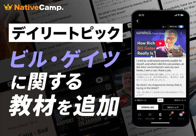 ネイティブスピーカーと回数無制限のオンライン英会話サービス「ネイティブキャンプ英会話」を展開する株式会社ネイティブキャンプ(東京都渋谷区 代表取締役:谷川国洋)は2025年3月16日(日)、人気教材「デイリートピック」にビル・ゲイツに関する教材を追加しました。