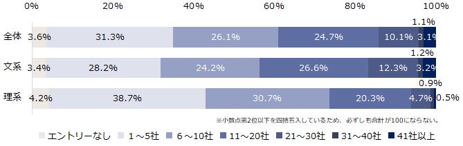 本選考にエントリーした(予定している)企業数を伺うと、文系の平均は「14.5社」、理系は「9.7社」でした。文系理系いずれも「1~5社」が最多(文系:28.2%、理系:38.7%)でしたが、理系学生はより厳選傾向にあることが分かりました。