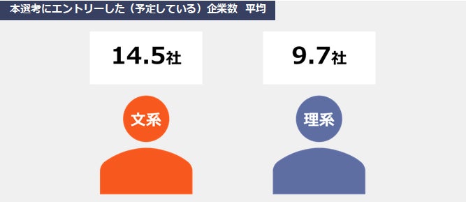 本選考に参加予定の企業数、平均は文系「14.5社」、理系「9.7社」。 志望業界のトップは「メーカー」。理系学生の半数が希望。