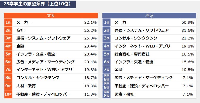 4:志望業界のトップは文系理系いずれも「メーカー」。理系学生の半数が希望。(図8、9)