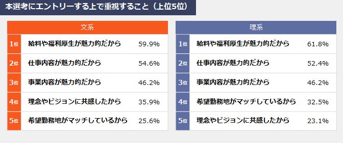 本選考にエントリーする上で重視することを伺うと、文系と理系で最もポイントに開きがあったのは「理念やビジョンに共感したから」で、文系が12.8ポイント高い結果になりました。(文系:35.9%、理系:23.1%)。