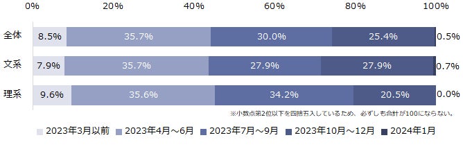 既に内定承諾をした方に、内定承諾先の企業と初めて接点を持った時期を伺うと、文系理系いずれも「2023年4~6月」が最多でした(文系:35.7%、理系:35.6%)。
