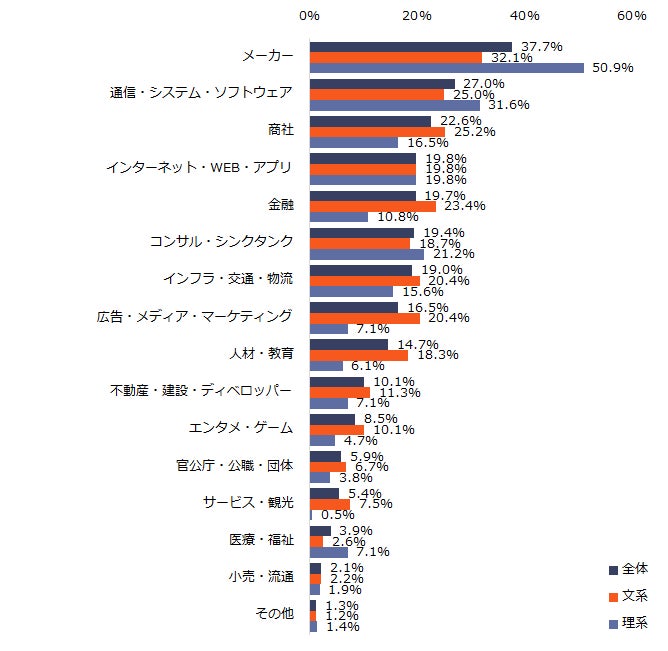 現在の志望業界を伺うと、トップは「メーカー」(37.7%)でした。文系理系いずれも第1位は「メーカー」(文系:32.1%、理系:50.9%)でしたが、第2位は、文系「商社」(25.2%)、理系「通信・システム・ソフトウェア」(31.6%)で順位に差が見られました。